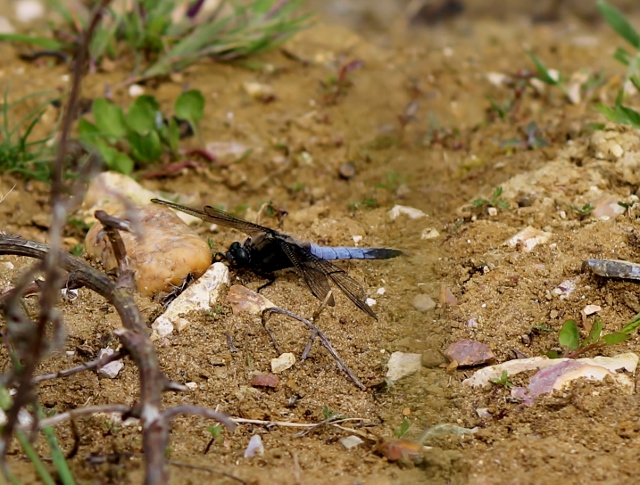 But this one (the burrow is in the shadow of one of the seed-pods) has been decorated with twigs, bits of wood, stone and seed-pods! I wonder if this is just by chance or if not, were these to make it easier to find or, is the bee just more of an individual, more artistic than most other bees?  I have found other nest-burrows seemingly marked with twigs and stones.