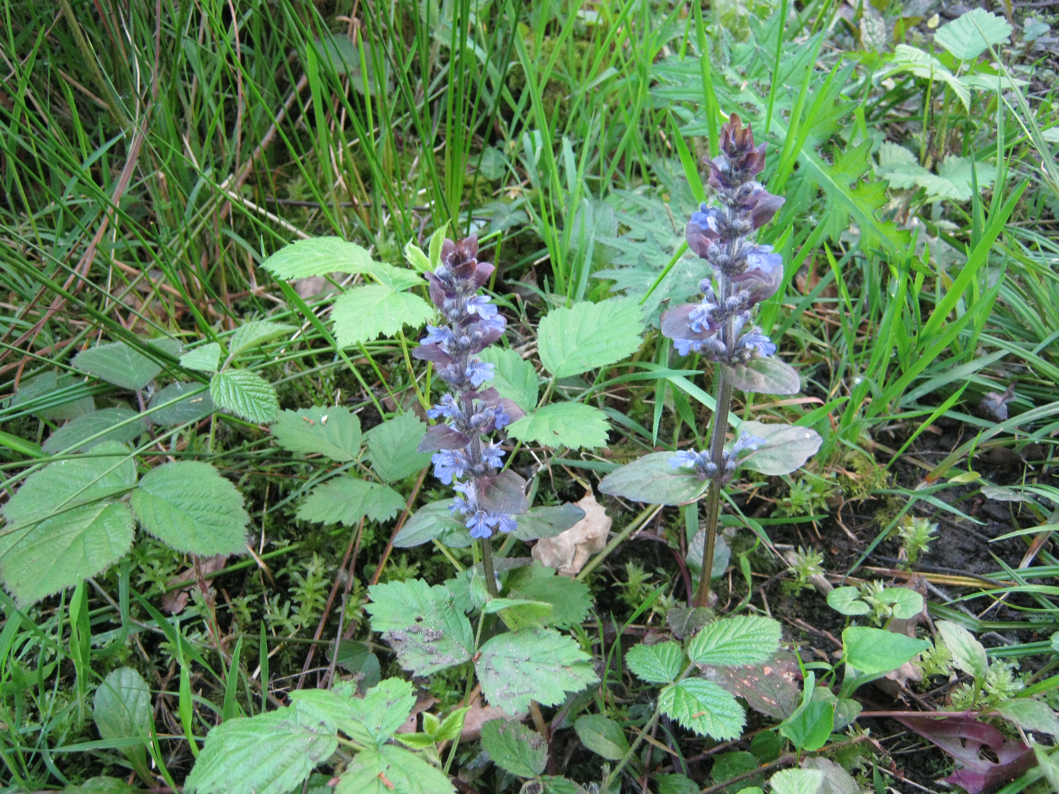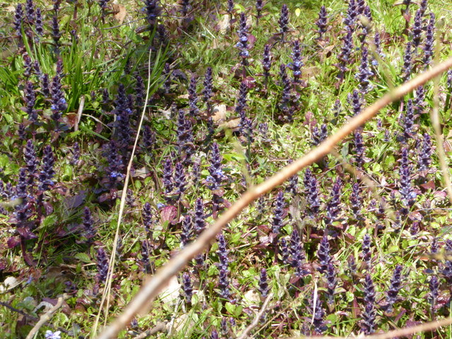 Grape Hyacinth (Muscari ), Bugle (Ajuga reptans ), Variegated Lesser Periwinkle(Vinca minor ) and Spindle (Euonymous ) ‘Emerald n Gold’.