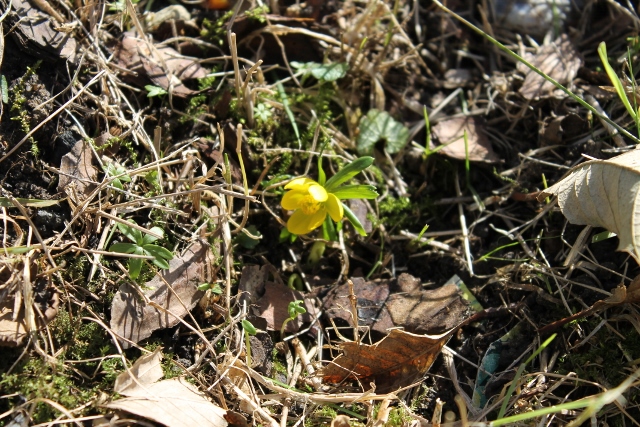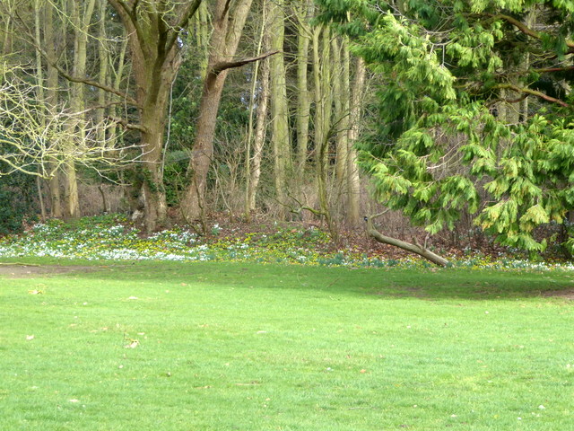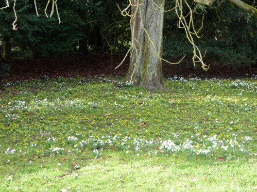 Snowdrops and winter aconites under the trees.