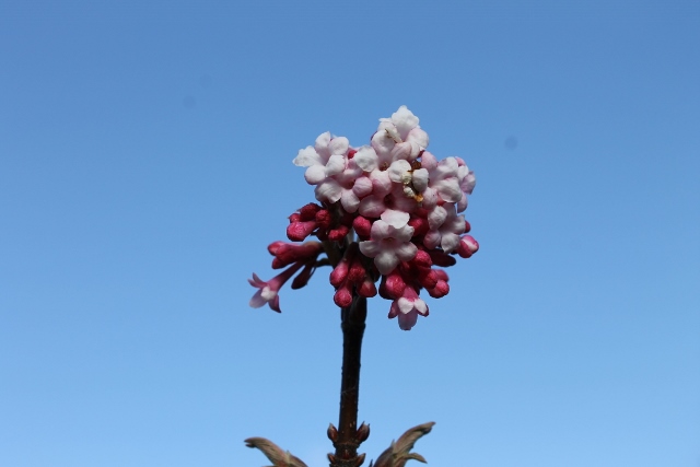 The pink Viburnum flowers look good against a blue sky. They smell wonderful too!