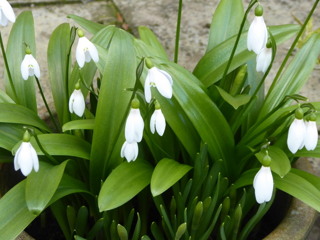 Snowdrops and a few daffodil buds in a pot