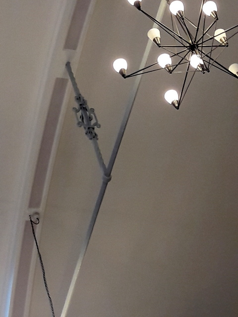 I am not referring to the modern lights but to the wrought iron that attaches the bar ( from which oil lamps were hung, I assume ) to the ceiling.