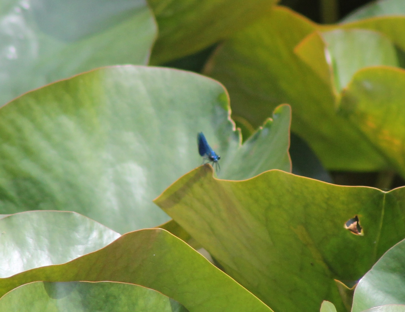 I walked down to the big pond to start with and watched lots of dragonflies and damselflies flitting about over the surface of the water. I tried to photograph them but without success – they flew too fast for me to catch them in flight and none of them seemed to settle for a second. I was excited to see a Banded Demoiselle Damselfly. I had seen one last year for a few seconds near the pond, but today I watched this one flying about for some time. I was anxious in case the dragonflies caught it, and though they attempted it a few times they didn’t manage to do it while I was there. In spite of the Demoiselle flying slowly and weakly (it flutters and flaps its wings like a large butterfly) I couldn’t catch it with the camera until it settled firstly on a lily-pad…